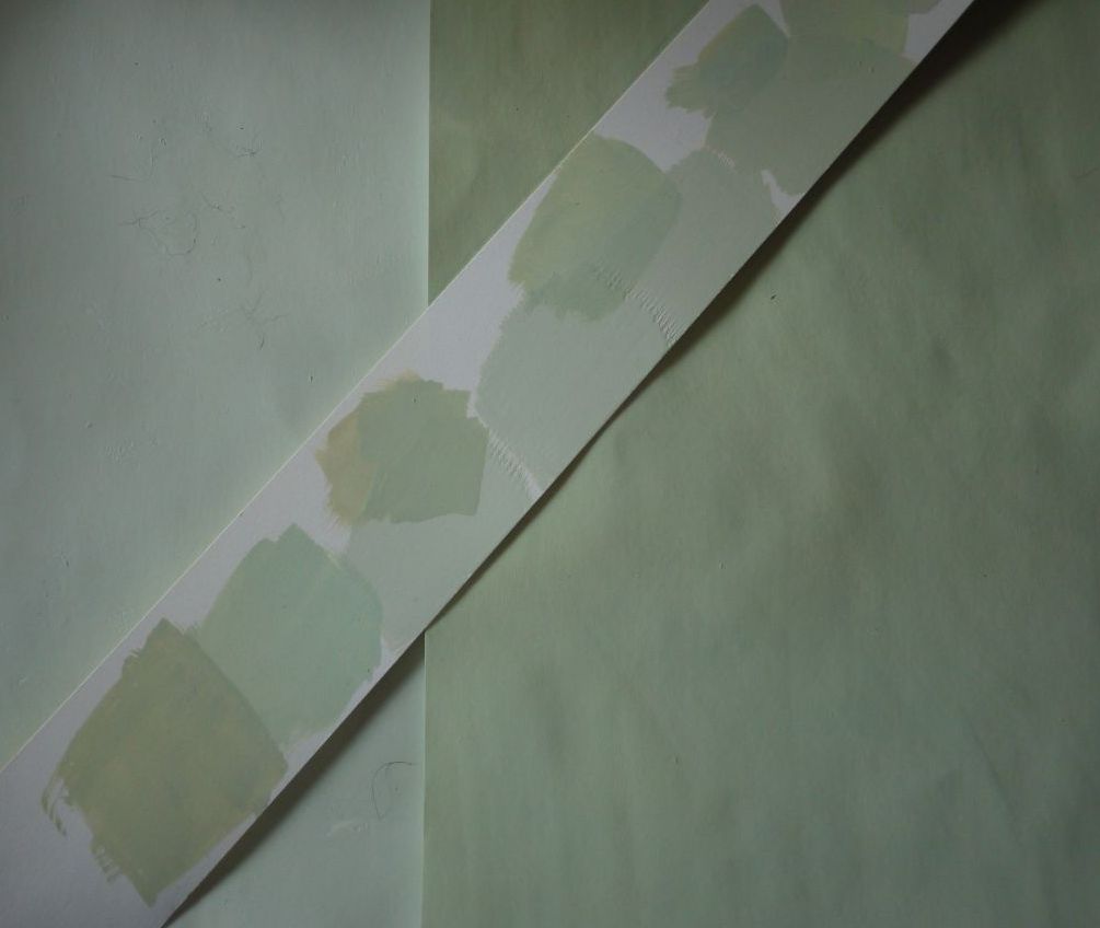 De är gjorda i guoache på akvarellpapper och ska föreställa ¨Lindblomsgrönt¨ i två tolkningar. Ovanpå ligger en remsa med blandningsprover.